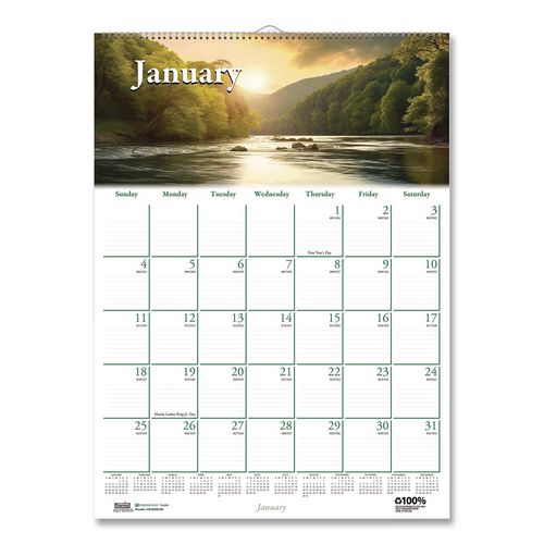 A beautiful panoramic full-color scenic photo, an inspirational quote and a full-year reference calendar on each month. Lightly ruled daily blocks help keep notations neat. Strong wire-binding firmly keeps the pages together and in place. Features a sturdy wire loop for easily hanging the calendar on the wall. Made entirely of recycled materials.Note: This is a non-returnable item.