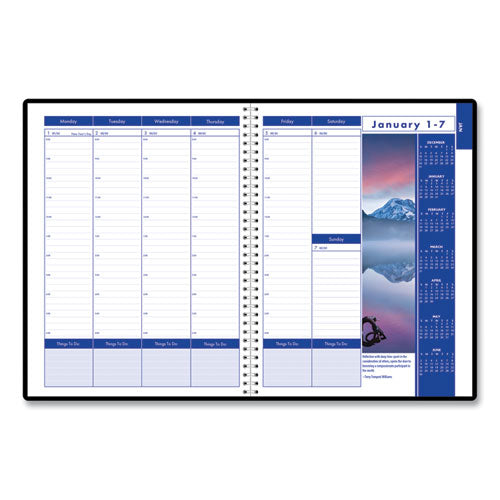 Enjoy nature scenes while scheduling your appointments and keeping yourself organized. Monthly and weekly spreads feature open note space and brightly colored die-cut tabs to help you quickly find the date you need. Reference calendar page detailing the current year and the next two full years, phone/address section for important contacts and an additional page with important holiday dates for three years. Includes a double-sided storage pocket. Black, embossed simulated-leather cover withstands daily use throughout the year. Made entirely of recycled materials.Note: This is a non-returnable item.