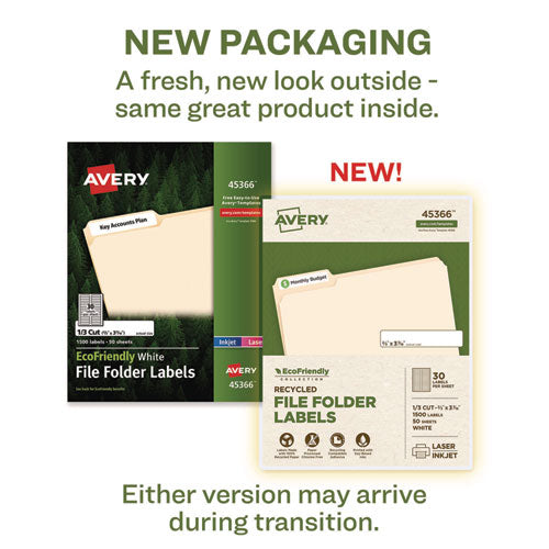 Get labels that work not only for you, but for the environment with these ecofriendly file folder labels. The labels and packaging are made of 100% recycled material and are processed chlorine free. When you're done, the labels and box are also recyclable. Easily customize your labels your way, using our free templates and designs from Avery® Design & Print.