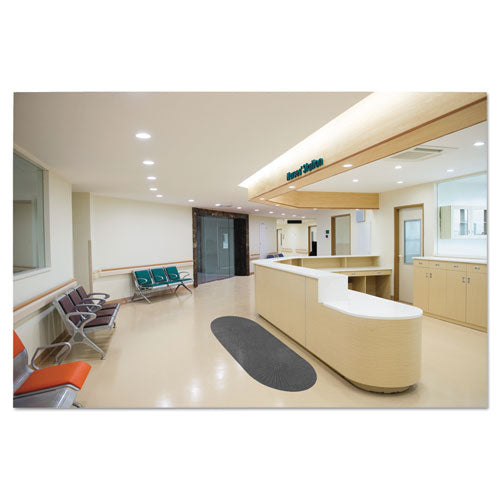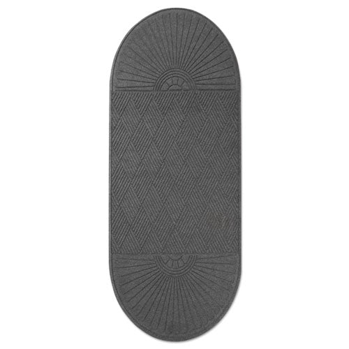 This mat's attractive diamond pattern enhances your entryway and adds a degree of elegance to your work environments. Carpeted surface is made from PET plastic bottles, and the all-rubber backing is made from used tires. Bi-level construction traps dirt and moisture below the surface so your interior spaces stay clean and dry. Beveled edges with fashionable fabric border are designed to reduce trips and falls. The durable rubber backing is slip-resistant to keep mat in position. Easy-to-clean-just sweep, shake out or vacuum. Recommended for hard surface floors and low-pile carpet entryways, hallways and lobbies.