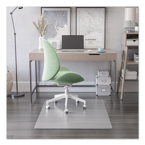 Our new line of EconoMat chair floor mats for hard floors have a non-studded bottom surface that provides a superior, non-skid grip surface ideal for hardwood, tile, laminate, linoleum or even concrete flooring. Its straight edges create a seamless transition from chair mat to hard floor surface. The EconoMat is also treated with Micropel Antimicrobial Protection, a powerful antimicrobial technology that protects the unwanted growth of mold and mildew as well as odor causing bacteria on the mat. Our ergonomic vinyl chair mats are UL Greenguard certified creating an safe, easy glide surface to help you move around your workspace.Note: This is a non-returnable item.