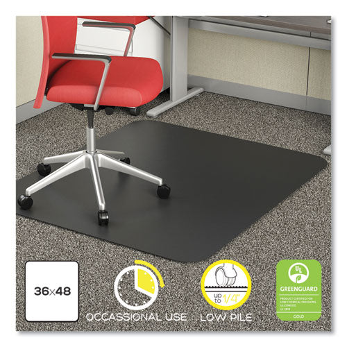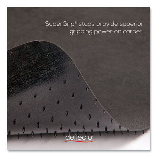 Thinner, lightweight EconoMat® delivers a great value to anyone looking for an occasional-use office chair mat to protect low pile and commercial carpets up to 0.25" thick. Easy-glide rolling surface provides smooth office chair movement to help minimize stress and strain on users back, legs and feet. Studded design grips carpet and keeps the chair mat from moving while protecting floors from caster wear, spills and heavy traffic. Free and Clear® non-orthophthalate, non-cadmium formula promotes a healthy work environment while offering exceptional clarity without harsh chemicals. GREENGUARD Gold Certified for low chemical emissions and healthier indoor air.Note: This is a non-returnable item.