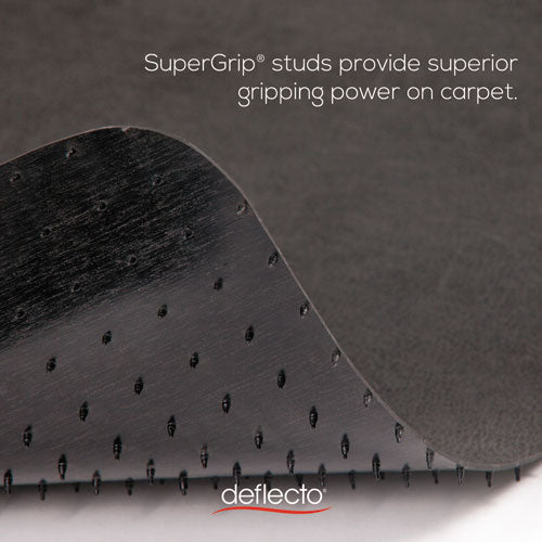 Thinner, lightweight EconoMat® delivers a great value to anyone looking for an occasional-use office chair mat to protect low pile and commercial carpets up to 1/4" thick. Easy-glide rolling surface provides smooth office chair movement to help minimize stress and strain on users back, legs and feet. Studded design grips carpet and keeps the chair mat from moving while protecting floors from caster wear, spills and heavy traffic. Free and Clear® non-orthophthalate, non-cadmium formula promotes a healthy work environment while offering exceptional clarity without harsh chemicals.