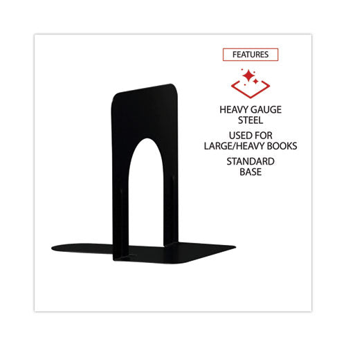Reinforced, sturdy, metal bookends are designed to hold large and heavy books, files, and binders. The bookends help organize your workspace by removing clutter and keeping files in sight. The smooth edges with ribbing add stability and rigidity to hold almost anything upright. Two heavy gauge steel bookends with a hard enamel finish keep items in place and within reach.