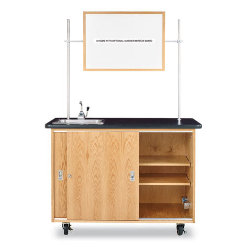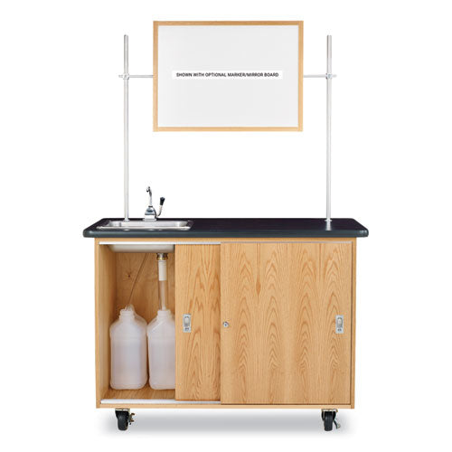 High-pressure, 1-1/4 thick laminate top with protective plastic molding. Solid oak and oak veneer cabinet with clear acrylic finish. Stainless steel sink and hand pump. Unbreakable aluminum sliding door glides and lock. Two adjustable shelves. 25-ft. grounded extension cord, two 2-gal. water bottles, connecting hoses, two 3/4" dia. upright rods, one 1/2" dia. crossbar and clamps. Optional Mirror/Markerboard, sold separately. Built-in Ground Fault Interrupt protected AC duplex electrical outlet. 4" ball-bearing swivel casters, locking. 48w x 24d x 36h.Package Includes: (2) 2-gal. Water Bottles; 25-ft. Grounded Extension Cord; AC Duplex Electrical Outlet; (2) 3/4" dia. Upright Rods; (1) 1/2" dia. Crossbar; Clamps; (2) Adjustable Shelves; Hand Pump; Hoses; Stainless Sink; Solid Oak; Oak Veneer CabinetNote: This is a non-returnable item.