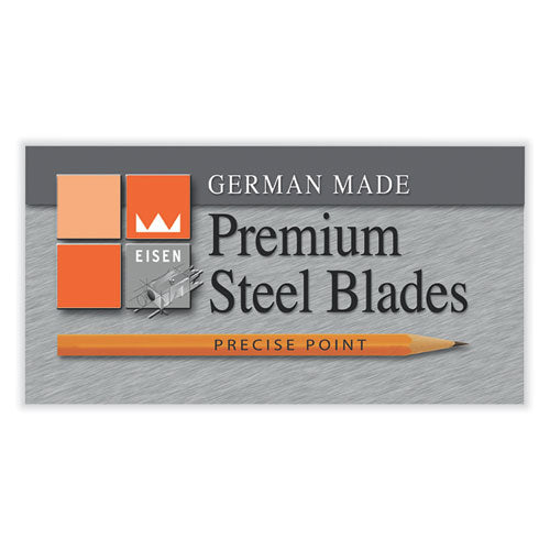 Keep your pencils on point with the Eisen manual pencil sharpener! This two-hole sharpener is compatible with most jumbo and standard woodcase pencils, and its kid-safe design makes it ideal for just about any classroom. Compact, handheld format is perfectly suited to nearly anyone's hands: children to adults, and the sharpener's generously sized canister keeps shavings from escaping until you're ready to empty it, minimizing the potential for messes. German steel blades remain sharp and effective, ensuring clean and easy pencil sharpening through the school year and beyond.