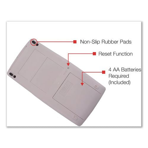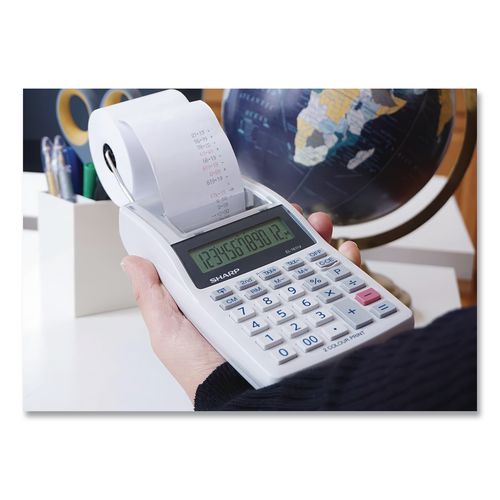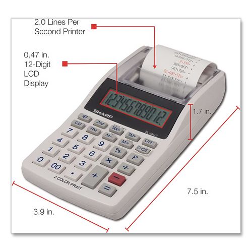 The EL-1611V Handheld Printing Calculator is perfect for those that want to take their work with them. It features a large 12-digit LCD display and a 2-color printer. The EL-1611V is compact, lightweight, and cordless, making it usable in any work environment. Other features include 4-key memory, tax keys, percent key, and selectable decimal and rounding keys.Package Includes: (4) AA Batteries; Instruction Manual
