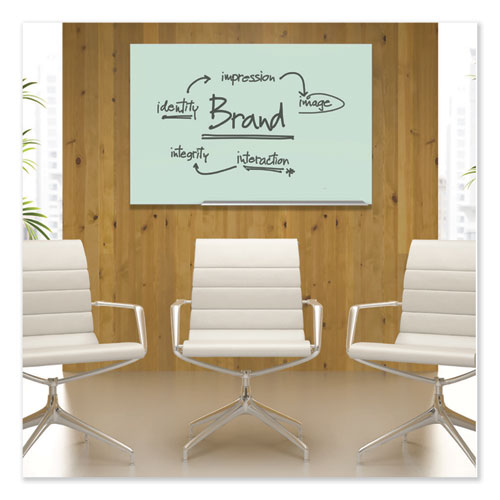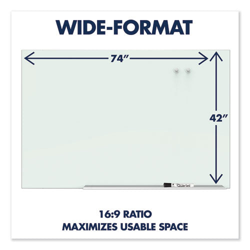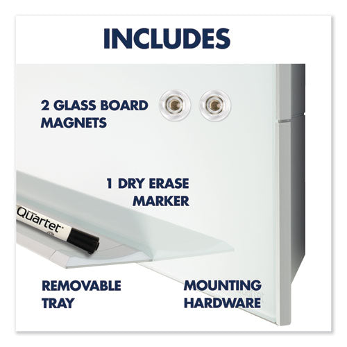 Designed for heavy use, tempered white glass surface is stain and ghost resistant for superior erasability. Modern framed glass design blends into any décor. Magnetic surface doubles as bulletin board. Wide format 16:9 aspect ratio increases usable space. Mounting hardware and template included for easy installation. Includes one quartet dry-erase marker, marker tray, and two rare earth magnets.
