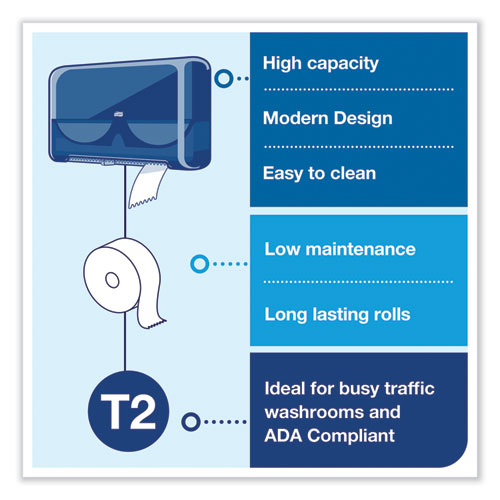 The Tork® Elevation® Bath Tissue Mini-Jumbo Roll Twin Dispenser is ideal for high-traffic washrooms where the guest experience is as important as high efficiency and low running cost. It ensures that tissue is always available by holding two full high-capacity rolls. Tork Elevation dispensers have a functional, modern design, that makes a lasting impression on your guests.