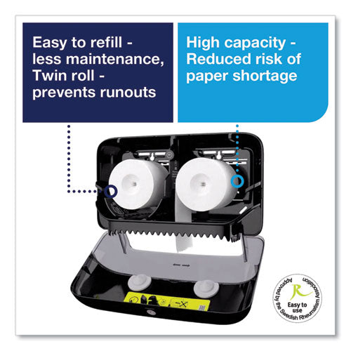 The Tork® Elevation® Coreless High Capacity Bath Tissue Dispenser is ideal for medium to high-traffic washrooms with high focus on guest satisfaction. Efficient dispenser ensures that toilet paper will always be available for guests by holding up to five times more paper than two conventional bath tissue rolls. Coreless rolls produce less trash to remove; Smart, stub-roll holder ensures full roll consumption to minimize waste. Compact horizontal dispenser saves space.