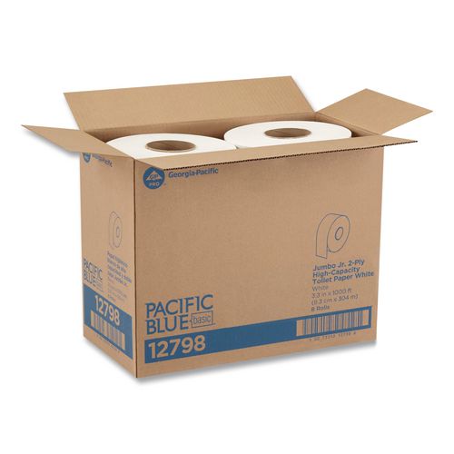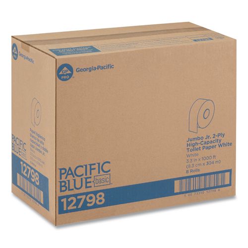 This Pacific Blue Basic™ jumbo bathroom tissue meets EPA guidelines for minimum post-consumer waste and is an economical choice for customers with high-traffic washroom areas that are concerned with sustainability. Ideal for washrooms in public facilities, schools, industrial/manufacturing, retail stores, and cafeterias/quick service restaurants, this jumbo-sized roll offers reduced maintenance intervals and greater customer satisfaction. Economical white tissue helps you stay in the black. Standard Jumbo Jr. sizing.