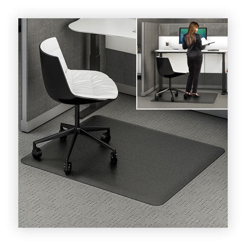This dual purpose cushioned mat combines the comfort and ergonomic benefit of an anti-fatigue mat with the smooth rolling surface of a traditional deflecto® office chair mat. Designed for use with standing desks and adjustable height workstations. The mat is ideal for users looking to transition effortlessly from sitting to standing. With 3/8" thick anti-fatigue support foam, this mat is comfortable on the feet, promotes wellness and reduces fatigue while standing. It also protects flooring from wear and tear caused by wheeled office chairs. The mat can also be used to cover worn, damaged or stained flooring.