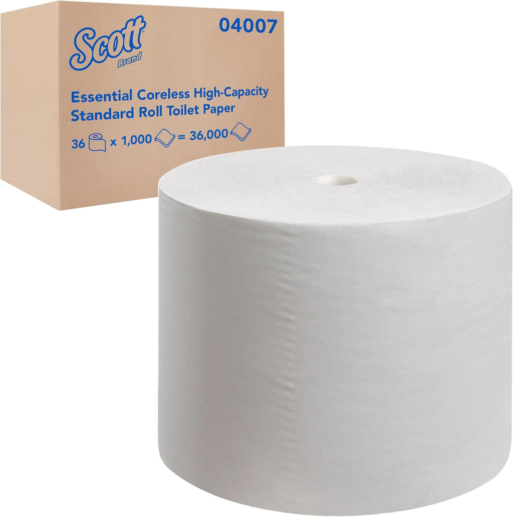 - 1,000 Sheets/Roll, 36 Scott Essential Coreless High-Capacity Standard Roll Toilet Paper Rolls/Case; 36,000 Sheets/Case; 2-Ply; White