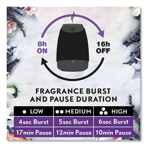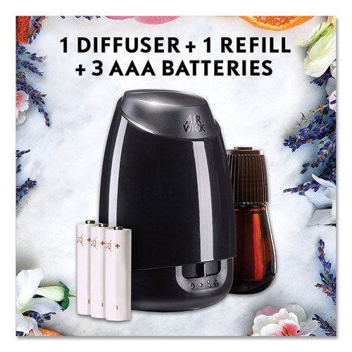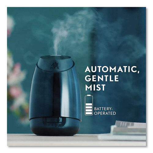Once started, the device automatically shuts off after 8 hours, restarting at the same time the next day - 8 hours on, 16 hours off. No water needed as it contains natural essential oils that diffuse into a mist through microscopic holes in the vibrating plate. Battery operated for placement anywhere. Each refill lasts up to 45 days on the lowest intensity setting. Batteries included.Package Includes: (1) Diffuser; (1) Refill; (3) AA Batteries