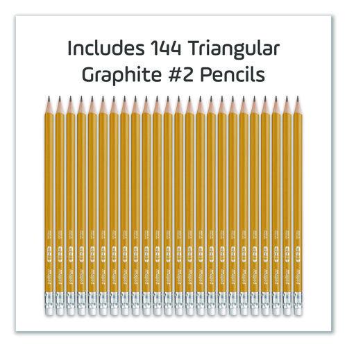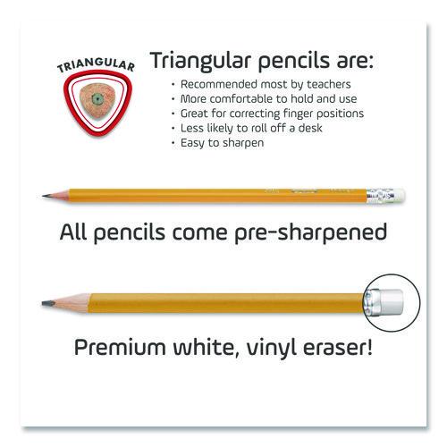Write more comfortably with this ergonomic, pre-sharpened #2 pencil! Unlike a standard hexagonal pencil, the triangular body of the Maped Essentials Pre-sharpened Pencils naturally index your fingers in the correct spots for a more comfortable hold, and they will not roll off of a desk or table! High quality graphite is break resistant and fully bonded to the wood casing so it sharpens and writes cleanly with no splinters or separated lead. Upgraded matte finish is easier to grip and will not slip during use, and fitted with a premium latex-, PVC- and phthalate-free eraser that cleanly removes graphite without smearing or tearing. Easy to sharpen in any standard pencil sharpener!