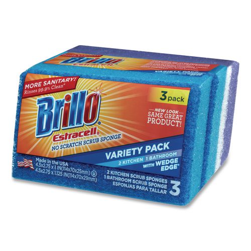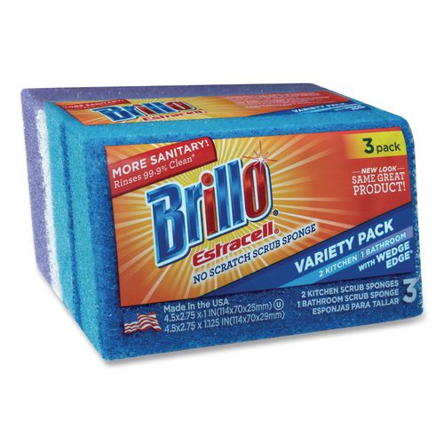 Brillo® Estracell® kitchen sponges are designed with unique fibers that dry faster, and rinse 10x faster than other sponges. Use a different sponge for each of your surfaces, so you can clean up without spreading bacteria around. This, plus the fact that bacteria won't grow on our Estracell® sponges, makes them more sanitary.Package Includes: (1) Bathroom Sponge; (2) Kitchen SpongesNote: This is a non-returnable item.
