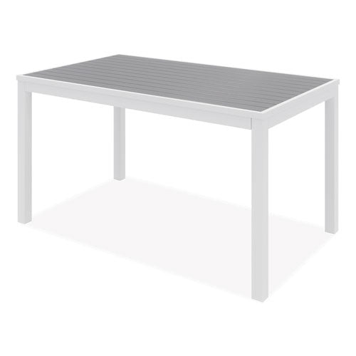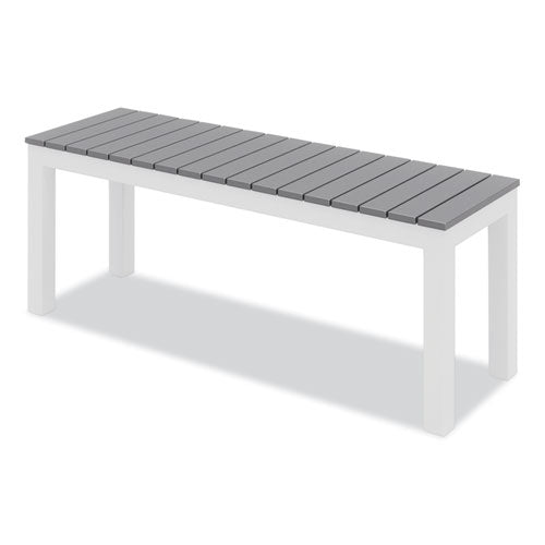 Stylish, stately and sturdy with an attractive, wonderfully practical design, Eveleen Outdoor Dining Table Sets have what you need to create a chic, comfortable space where you or your patrons can find a bit of outdoor respite. Featuring dent- and scratch-resistant, easy to clean "polywood" synthetic-polymer surfaces along with corrosion- and fade-resistant aluminum frames, the whole package is water-, mold- and temperature-resistant, fully primed to withstand the elements, making this set an ideal choice for outdoor use, whether you need to fully furnish your restaurant's patio or you simply need to find a suitable picnic-table alternative for your home's backyard. Set includes two matching, wide-format benches and two matching armchairs to achieve a tailored, cohesive look. which is perhaps everything you need to craft your ideal outdoor oasis. Chairs and benches ship fully assembled; table requires assembly.Package Includes: (2) Benches with Gray Seats and White Bases; (2) Armchairs with Gray Seats/Backs and White BasesNote: This is a non-returnable item.