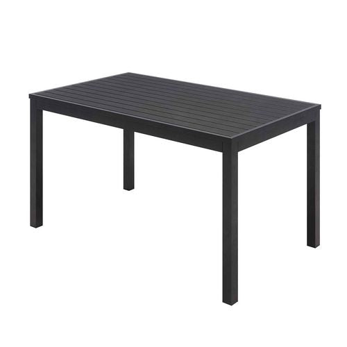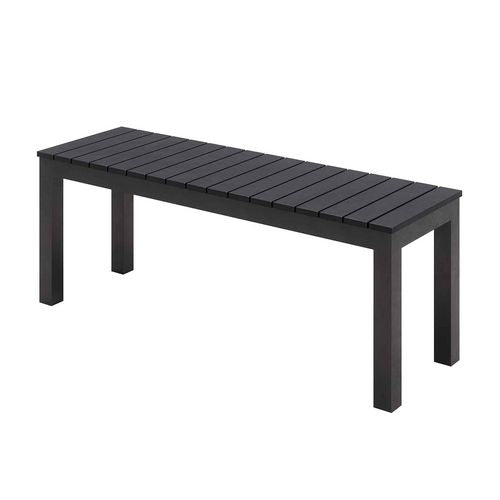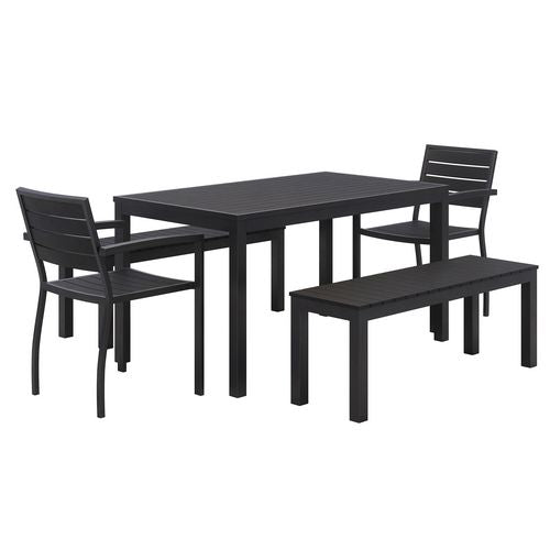 Stylish and sturdy, Eveleen is designed to provide the perfect respite outdoors. With its contemporary design, the Eveleen chairs and benches are a go-to option for creating a chic yet comfortable outdoor space. Constructed from durable aluminum and polywood slats, Eveleen is designed to withstand the elements.Package Includes: Black 32 x 55 Rectangular Polymer Table Top; 26" Tall Black Square Leg Table Base; (2) Black Powder-Coated Polymer 18" Seat Height Benches; (2) Black Powder-Coated Polymer 18" Seat Height ChairsNote: This is a non-returnable item.