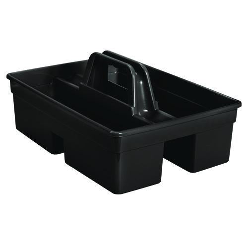 Sturdy, all-purpose caddy is perfect for carrying tools or cleaning supplies. Convenient molded carry handle makes carrying easy. Divided carry caddy conveniently fits on most cleaning or housekeeping carts. Flat sides and bottom fit all different types of cleaning supplies.