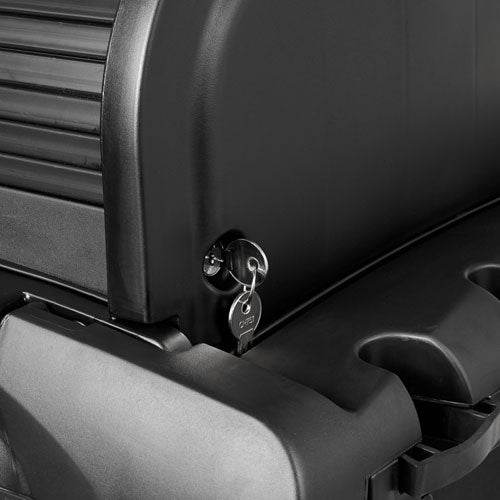 Select a janitorial cart with strength and security as well as an attractive appearance. Pre-assembled locking hood and doors provide additional security. Spacious cart provides plenty of storage - up to 7.25 cubic feet of space, with removable bins and caddies. Its compact size allows it to fit in constrained spaces. Durable 8" ball bearing wheels and quiet 4" casters. Interchangeable handles and removable platform. Mop bucket platform with securing grooves keeps WaveBrake® or microfiber charging buckets securely attached to cart.Package Includes: (1) PVC-Lined Fabric Bag; (2) Keys