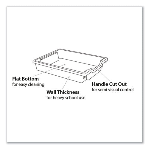 Iconic, Worlddidac award-winning F1 Shallow Trays are found in learning environments all over the world. Made of fully recyclable materials, each tray is molded to a standardized size for seamless integration into Gratnells Storage Frames and Trolleys, so you can easily reconfigure your bins and resource areas to the unit or project at hand. With enough foresight, you can even color-code accordingly. Loved by teachers and students alike, these strong, rigid bins are all BSI approved for heavy educational use. Semi-fire-retardant (0.22 mm per minute), anti-static, talc-filled polypropylene construction ensures high-resistance to a variety of chemicals and contaminants, making it a superior choice over ABS in almost any environment, doubly so in science labs as well as art, shop and electronics classrooms. Whether it's art or science-lab supplies, whether it's worksheets or robotics kits, there's a tray to meet your needs. Stackable and nestable with built-in carry handles, these bins are also compatible with a variety of available dividers and lids (lids and dividers sold separately).Note: This is a non-returnable item.