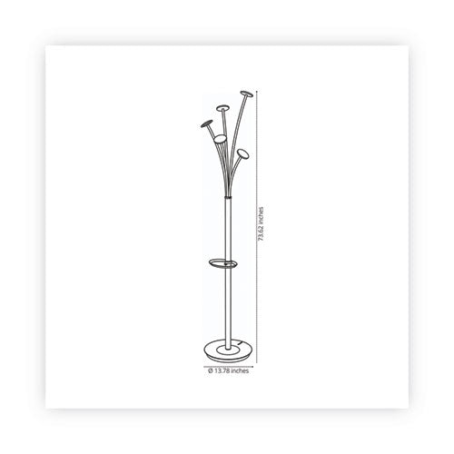 Features a contemporary look. Stylish and functional. Includes five coat knobs, an umbrella stand and a water retainer. Weighted base for perfect stability. Easy assembly, no tools required.