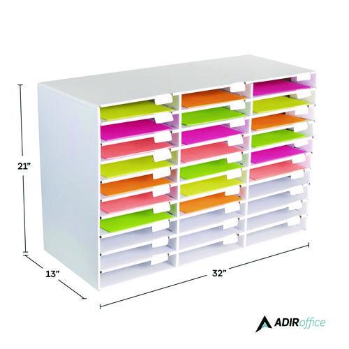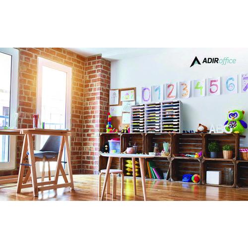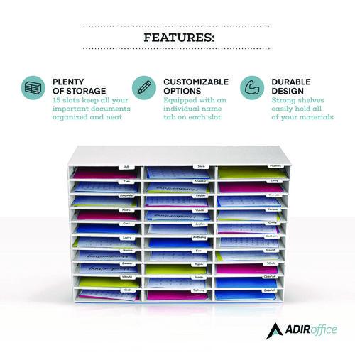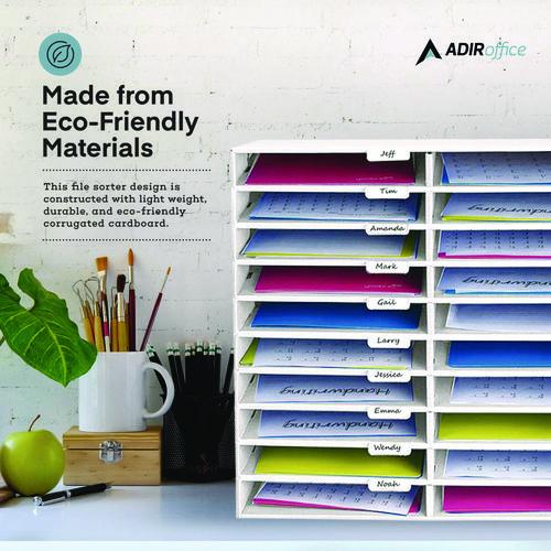 Maintain a clean and organized environment in your classroom or office with the AdirOffice Classroom File/Literature Organizer. This compact yet efficient storage solution features multiple open slots designed to neatly store papers and folders. Each slot offers ample room, allowing you to easily slide in stacks of papers, magazines, notebooks, or slim binders without occupying excessive space. Constructed from cardboard, the sturdy cabinet boasts a durable design with strong shelves that can effortlessly bear the weight of your items. Additionally, you can easily assign slots based on name, project, or year by using labeled stickers on the innovative slot tabs, ensuring a well-structured and easily navigable filing system.Note: This is a non-returnable item.