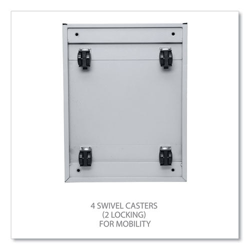 Get organized with a high-sided file cabinet with drawers that accommodate letter or legal-sized hanging files. Steel ball bearing telescoping slide suspension helps drawers glide smoothly and with ease. Equipped with four casters, two locking, two non-locking. Full-length pull permits easy opening. Single key core removable lock with two keys.