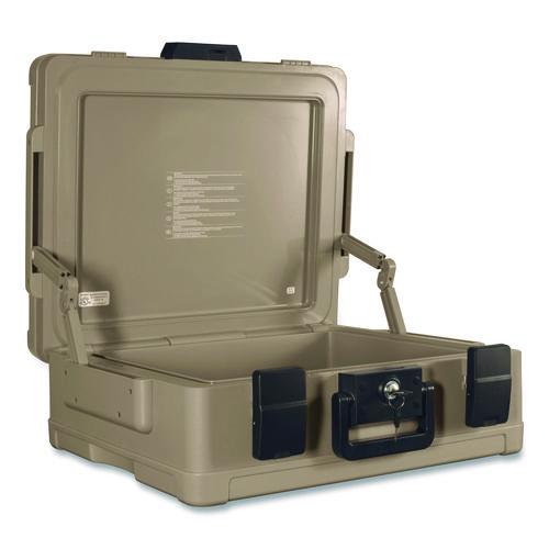 Designed to meet the security needs of today's consumer by protecting CDs/DVDs, flash drives, portable hard drives and other valuables from fire and water damage. Accommodates letter- and legal-size documents. Dual compression latches and handle. Waterproof for two hours.Package Includes: (2) Keys