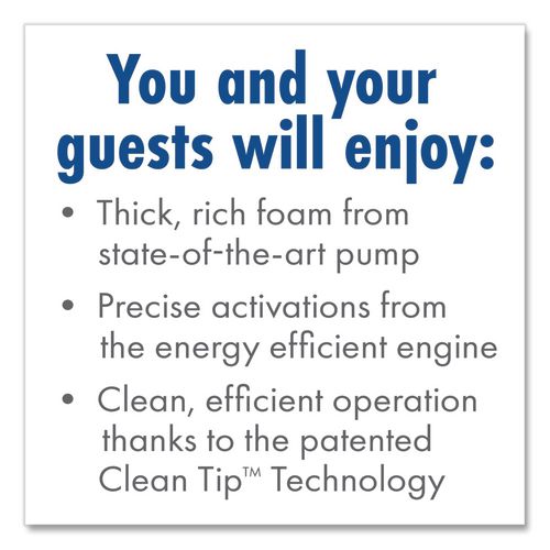 Dial® FIT® dispenser features the smallest footprint and cubic area in its class with subtle curves that complement the aesthetics of any washroom. Enjoy Thick, rich foam from our state-of-the-art pump. Dispenses 0.8 mL for at least 1,500 activations maximizing housekeeping efficiency. Clear side panel strip for fill-level visibility without opening. "Rapid Activation Restriction" prevents excessive output. Made from ABS plastic for maximum durability. Clean Tip™ Technology cleans the pump tip after each use to minimize drip risk.