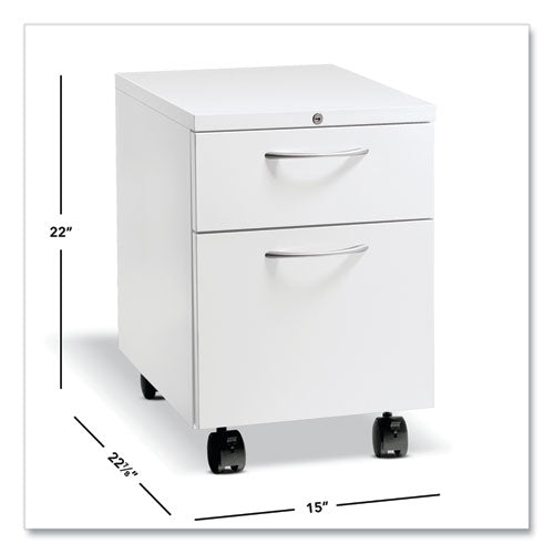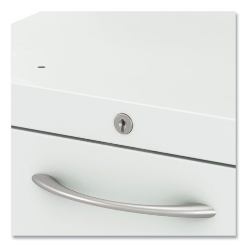 Steel ball bearing suspension; full extension on file drawer, 90% extension on box drawers. High-sided file drawer allows front-to-back letter-size filing and includes follower block and crossrail. Counterweight inhibits tipping when opening more than one drawer. Fits under 29.5" high workstations. Fixed front casters and swivel back casters for easy mobility. "One Key" core removable lock makes re-keying quick and easy.Note: This is a non-returnable item.