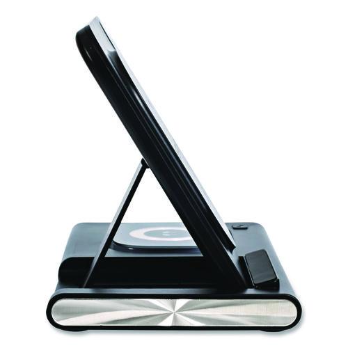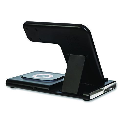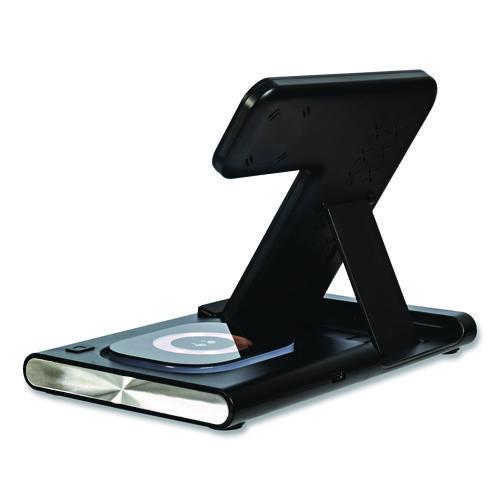 Charge up to three devices at once! Tidy up your space and eliminate cable clutter by charging your phone, watch and earbud case simultaneously. With our included fast charging adapter powered by the Qualcomm QC 3.0 chip, you'll experience lightning-fast charging speeds. The stand features a magnetic holder to keep your phone and watch securely in place and even has a light in the base for added convenience. This high-quality charging stand is perfect for your desk or usual charging area, combining functionality with sleek design. Folding design makes it convenient for travel!Package Includes: USB-C Cable; User Guide