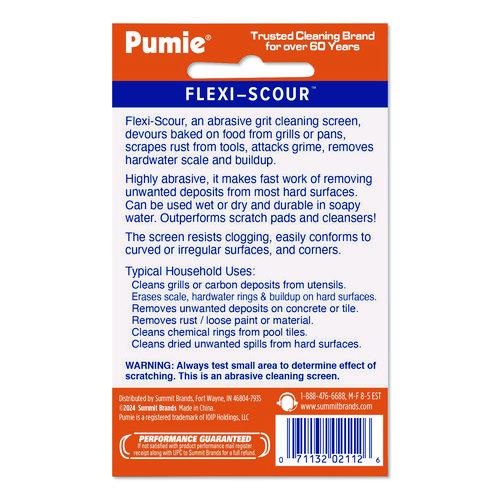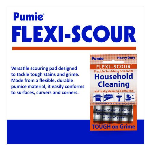 Pumie® Flexi-Scour™ is a versatile scouring pad designed to tackle tough stains and grime. Easily conforms to irregular surfaces, curves and corners. Highly abrasive grit cleaning screen makes fast work of removing unwanted deposits from most hard surfaces including baked on food from grills or pans, scrapes rust from tools, deposits on concrete or tile, attacks grime, and removes hardwater scale and buildup. Can be used wet or dry and is durable in soapy water. Outperforms scratch pads and cleansers.Note: This is a non-returnable item.