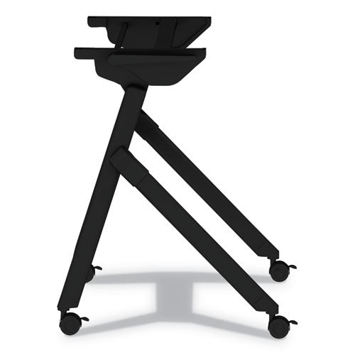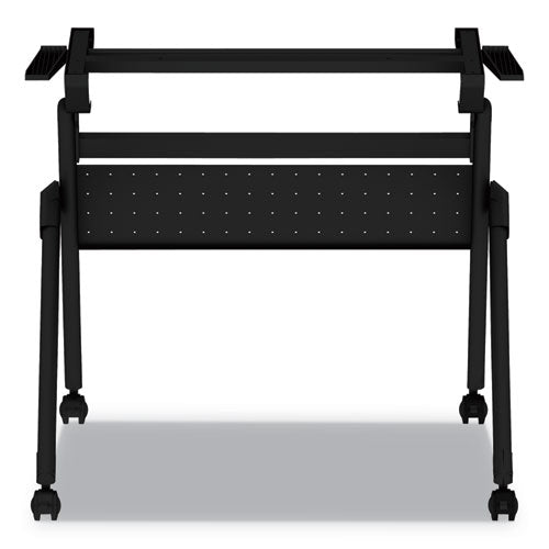 With a handy lever on both sides, simply flip-up for fast setup or flip-down to nest away. Vertically aligned nesting design ensures a small storage footprint. Includes detachable punched-metal privacy panel. Compatible with most table tops. Durable, powder-coated steel resists chipping and scratching. Four locking casters for mobility. All hardware included.