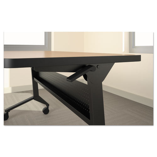 Dual-sided levers for a quick-flip of the top. Tables nest for compact storage. Steel base with integrated modesty panel with built-in cable trough. Four locking casters.