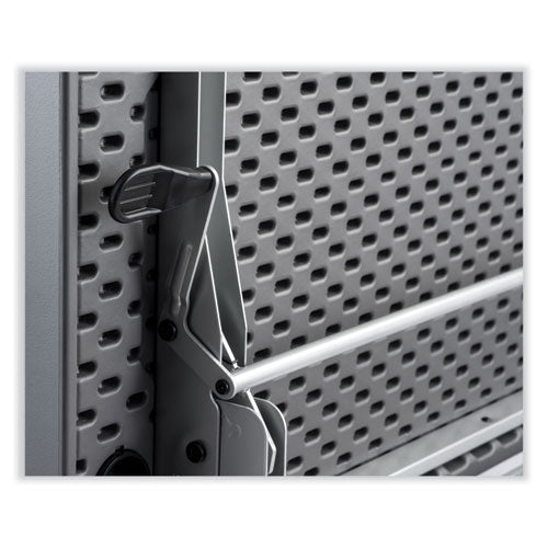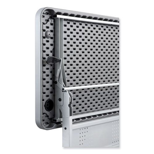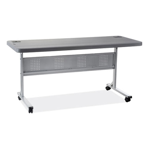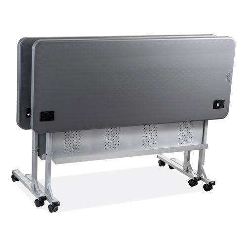 The Flip-N-Store, our blow-molded polyethylene flipper table, is a fantastic addition to any training/conference room or seminar set-up. Its smoothly textured high-density plastic surface flips open and closed with a dual-lever mechanism for amazingly convenient use and storage. Simple to clean and lightweight, the tables also nest together to save space and roll with ease on four 2 casters (two locking). These units feature a reversible modesty panel made of perforated steel with a built-in cable channel as well as removable dual grommet holes for wire management while keeping electronic devices connected and charged. The powder coated frame and legs are made of strong powder-coated steel and boasts a weight capacity of 700 lbs. Affordable and a cinch to assemble, you'll flip for the Flip-N-Store!Note: This is a non-returnable item.