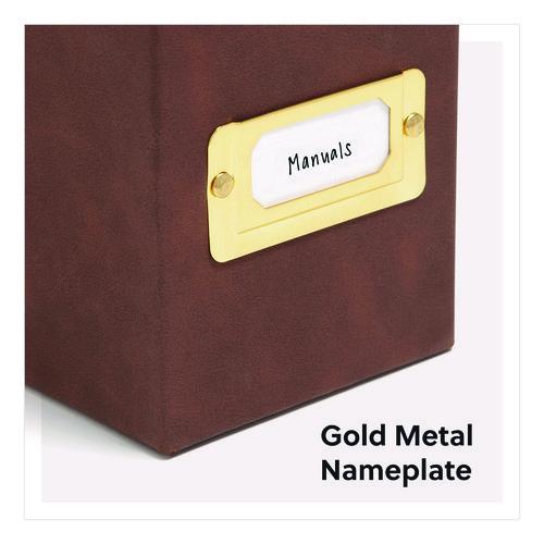 Subtle and sophisticated storage—the Smead® Flip Top File Box provides efficient upright organization with a refined touch. Featuring an attached protective lid and a gold metal nameplate for easy labeling and identification, it makes an excellent organizational solution. Keep loose items tidy on your desk, counter, or shelf while adding decorative neutral accents to your space. Perfect for desk, counter, or shelf use, its sleek design adds elevated organization to any office or home. Pair multiple boxes side-by-side for a cohesive, clutter-free look that is as practical as it is chic.