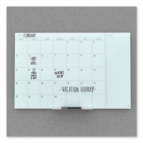 White frosted dry erase calendar board is a perfect and functional solution for the frequent and heavy usage areas of your office, school classroom, home or any commercial space. Clean, contemporary and frameless product design lines will add a touch of subtle style to your wall. The modern frameless feature enables you to hang multiple glass boards adjacent to each other and expand the writing surface to fit your custom space needs. The board's premium ultimate glass writing surface will never stain or ghost. Monthly view enables you to keep track of your hectic schedule. All ink erases easily with a simple eraser and the glass surface continuously outperforms all traditional melamine or painted steel dry erase writing surfaces. Occasionally, use any dry erase board spray or wet dry erase board wipes after continuous use to clean the writing surface. Although all dry erase and glass markers work well with this board, the U Brands dry erase markers provide the ultimate writing and eras-ability experience. For safety, the board is made from tempered glass as well. Modern frameless design includes hidden mounting brackets that give the impression that the board is floating on the wall. Mounting hardware and instructions are included for quick and easy mounting. The board is packaged with extra supportive corrugate material that is highly resistant to damage during shipping; all corrugated material can be recycled once unpacked.Package Includes: (6) Assorted Liquid Glass Marker; (1) Shag Eraser; Mounting Hardware; Instructions