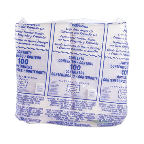 Foam Hinged Lid Container, Performer Perforated Lid, 9.3 x 9.5 x 3, White, 100/Bag, 2 Bag/Carton