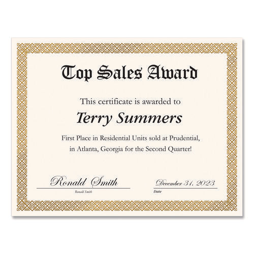 Create an award or give recognition to an individual with this foil enhanced certificate. Certificate is 8.5 x 11 and may be used landscape or portrait. Printed on cover stock, acid and lignin-free paper. Compatible with most inkjet and laser printers.
