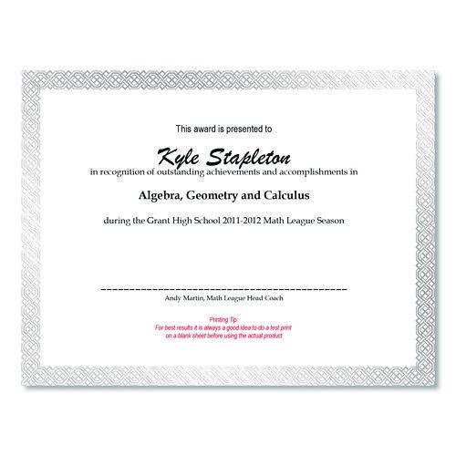 Create an award or give recognition to an individual with this foil enhanced certificate. Certificate is 8.5 x 11 and may be used landscape or portrait. Printed on cover stock, acid and lignin-free paper. Compatible with most inkjet and laser printers.