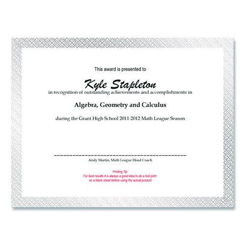 Create an award or give recognition to an individual with this foil enhanced certificate. Certificate is 8.5 x 11 and may be used landscape or portrait. Printed on cover stock, acid and lignin-free paper. Compatible with most inkjet and laser printers.