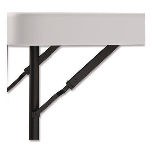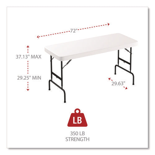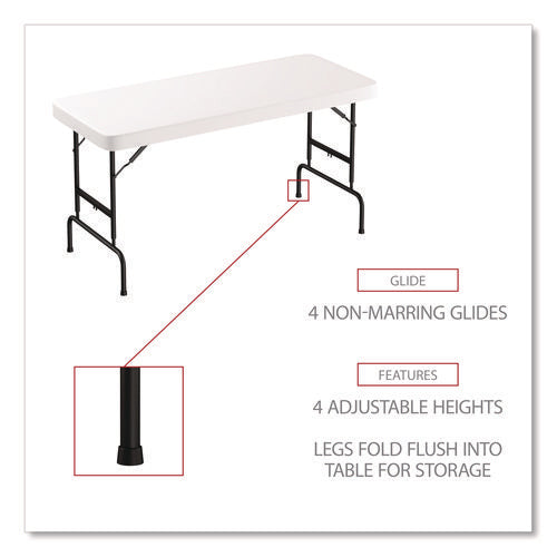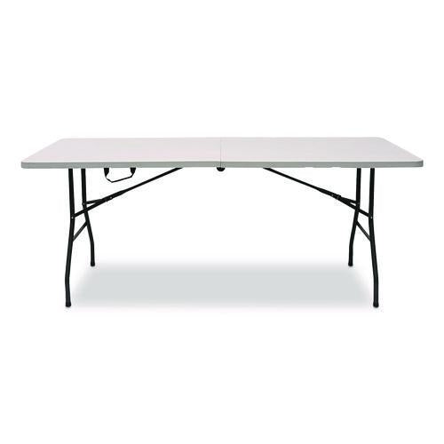 Versatile table is perfect for indoors or outdoors. Convenient rectangular folding table sets up quickly when extra table or counter space is needed. Blow-molded polyethylene top is water and stain resistant to ensure it won't crack or stain. Strong, durable, powder-coated metal construction withstands dents and scratches. Slide lock feature enhances table stability once opened. Legs fold flush into table creating a flat surface for easy storage and stacking. Non-marring foot caps to prevent floor damage.