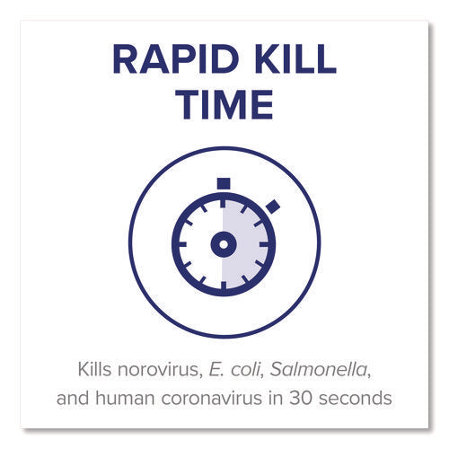 Formulated for convenience and ease-of-use, Foodservice Surface Sanitizer Spray provides powerful germ-kill on the surfaces people touch most yet is gentle enough to use on a child's highchair with no rinse required. Patented fragrance-free formulation sanitizes without any harsh chemicals. It eliminates 99.9 percent of viruses and bacteria on surfaces including norovirus, E. coli, Salmonella, and human coronavirus in 30 seconds.