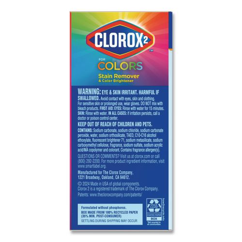 Clorox 2® for Colors Stain Remover and Color Brightener Powder removes tough stains and odors the first time. The 3-in-1 formula eliminates tough stains, brightens colors and helps remove odors to keep your laundry fresh and bright all in one wash. Change the way you wash your clothes with this quick and simple brightener powder that works great on stains such as dirt, grass, spaghetti sauce and red wine or whatever mess life throws at you. Just measure out a scoop of stain remover and color brightener powder and add it in with your favorite detergent. Safe for every load and safe for all colors and fabrics, the convenience of this powder makes it simple to brighten your wash and keep whites looking white. For use in regular and HE washers, add a scoop to every load to fight stubborn stains and extra-dirty loads and keep them looking like new in one easy step. Ideal for use in hotels, laundry mats, restaurants, daycare centers, and other commercial facilities.