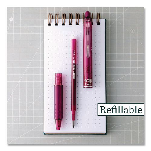 FriXion Clicker combines the convenience of a retractable with amazing erasable gel ink. Pilot® FriXion gel ink pens allow you to write, erase and rewrite without damaging documents or leaving behind messy eraser crumbs. The unique, thermo-sensitive gel ink formula offers vibrant color and smooth writing.