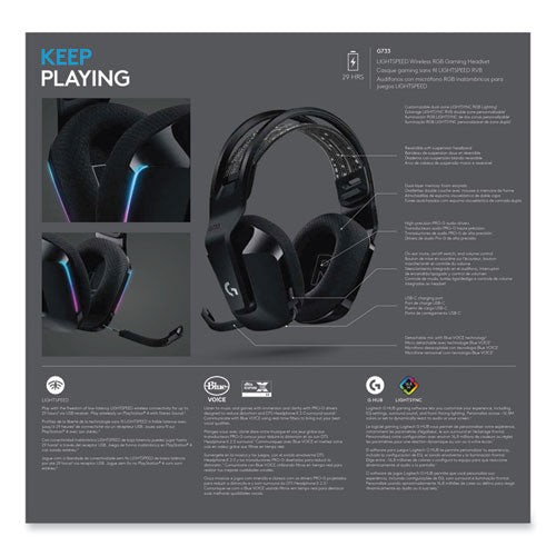 Meet G733, a gaming headset designed to suit your style. Embrace total wireless with 2.4 GHz LIGHTSPEED wireless, featuring up to 20 m of range and up to 29 hours of battery life. Customize how you look and sound in G HUB with dual-zone, front-facing LIGHTSYNC RGB and Blue VOICE real-time voice filters. G733 features advanced audio technologies, including 40 mm PRO-G audio drivers, internal acoustic chambers, and DTS Headphone: X 2.0. Play your way with a comfortable, reversible headband, dual-layer memory foam earcups, and a lightweight headset that weighs just 278 g.Package Includes: Detachable Mic; USB-C to USB-A Charging Cable; USB Wireless Receiver