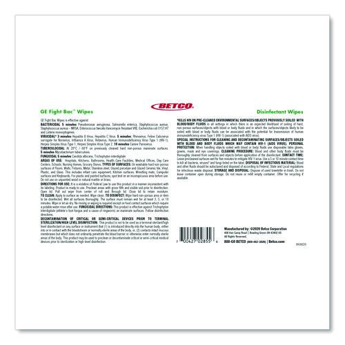 GE Fight Bac disinfecting wipes kill over 99.9% of bacteria and viruses in five minutes of contact time. Formulated with a botanical active ingredient, citric acid, and without harsh chemicals, this product provides superior disinfection without the need for safety signal words like danger or warning, easing the minds of users. Perfect for use on hard surfaces, computers, mobile phones, nonporous surfaces and acrylic.