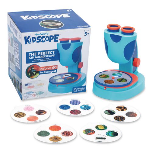 Introductory microscope for kids! The perfect microscope to deepen scientific investigation through the introduction of microscope slides! Budding scientists can use this microscope to view incredible images 3x larger, using two extra-large eyepieces and an easy-focus knob for a crystal-clear view and frustration-free experience every time.Package Includes: (15) Printed Slides with (4) Images Each; Science GuideNote: This is a non-returnable item.