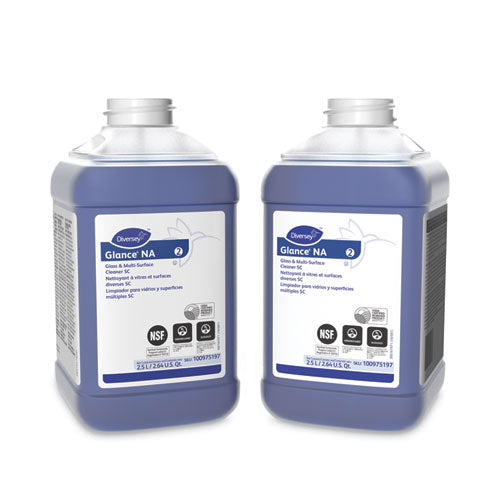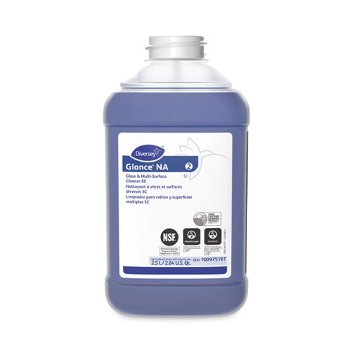 Glance NA is a market leading glass and surface cleaner. Non-streaking, quick-drying and non-ammoniated. Formula is economical and safe. Use on most washable surfaces, including chrome, stainless steel, bathroom fixtures and laminate countertops. Blue in color with no fragrance added.